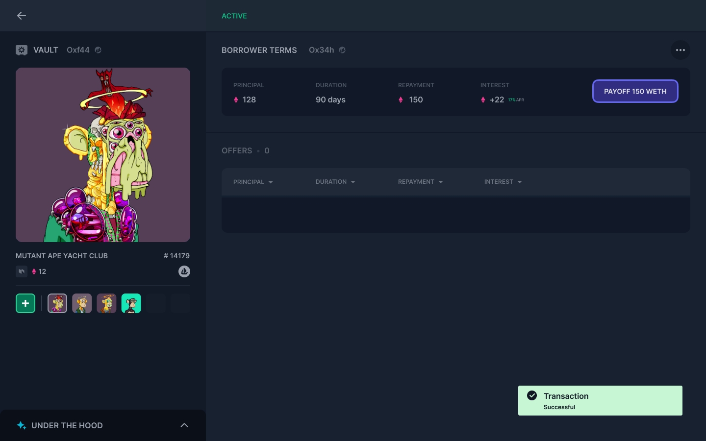 Payoff Loan。 一旦完成,第二笔交易将出现在用户的钱包中。该交易是与协议偿还贷款的合约交互,以偿还贷款。 借款人必须在连接的钱包中确认交易才能偿还贷款。