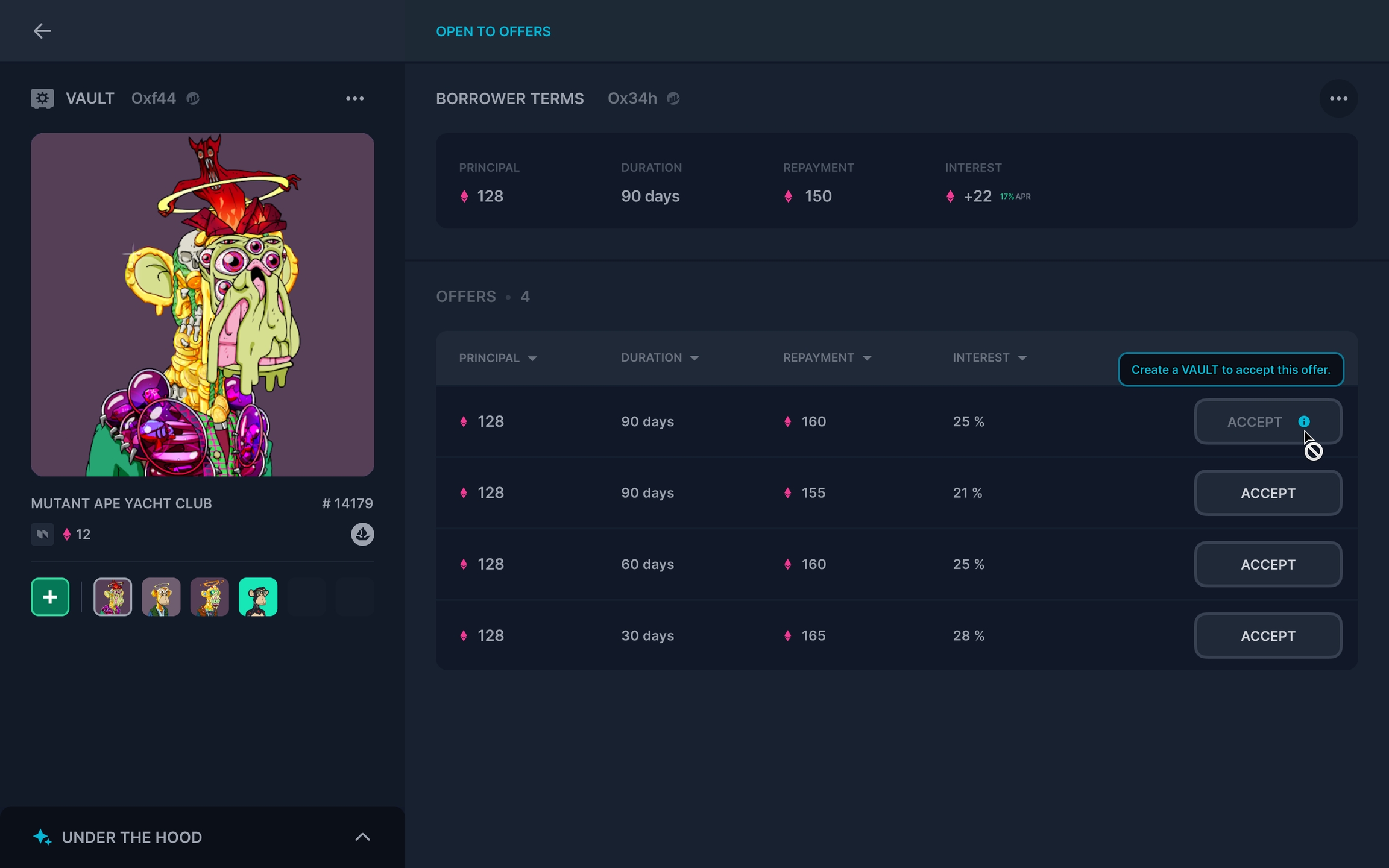 选择保险库或单个 NFT 后,资产详细信息页面将显示贷方对资产的未付报价。 每个报价都将详细说明报价的经济情况,包括:本金金额、期限、支付金额和利息。