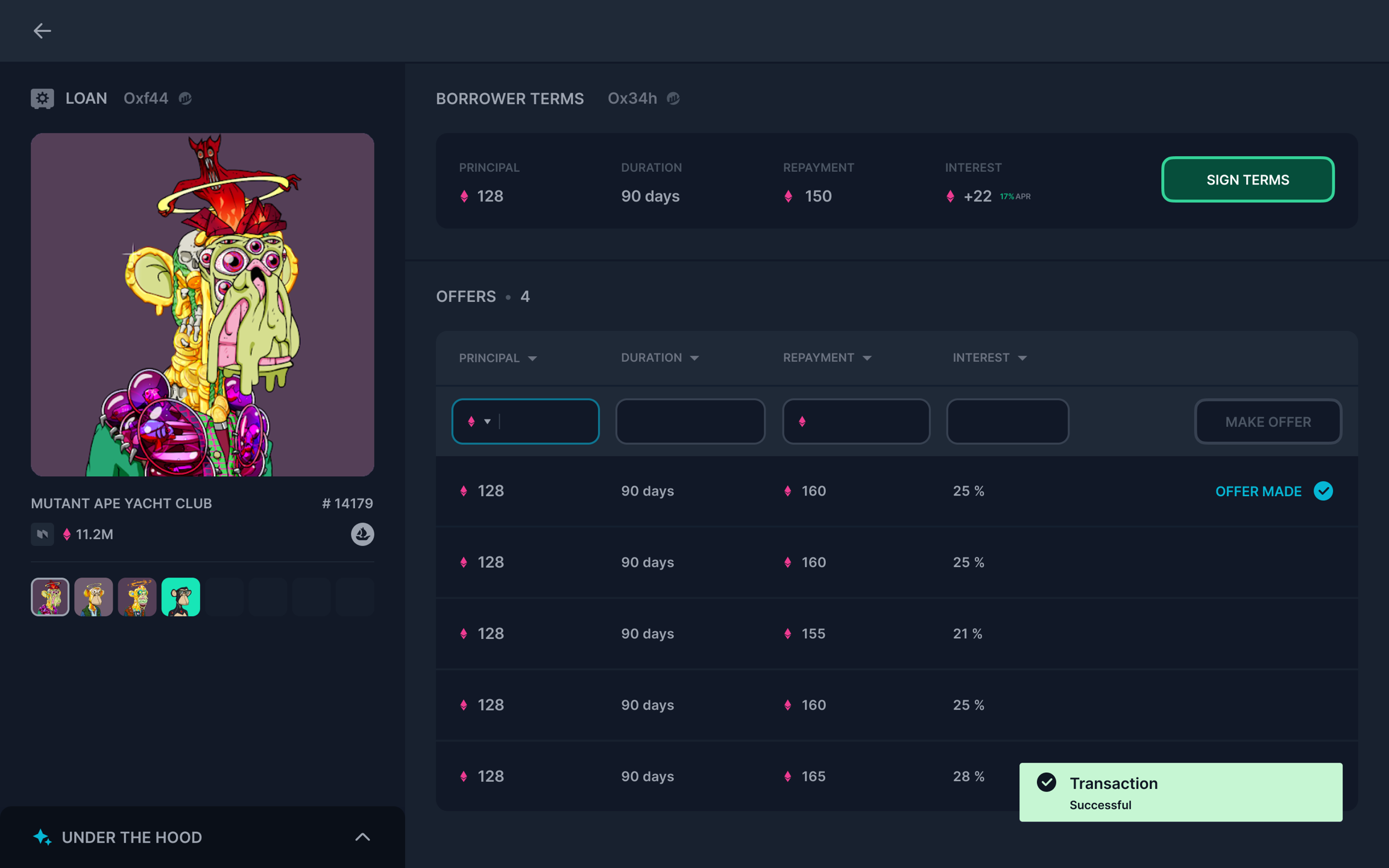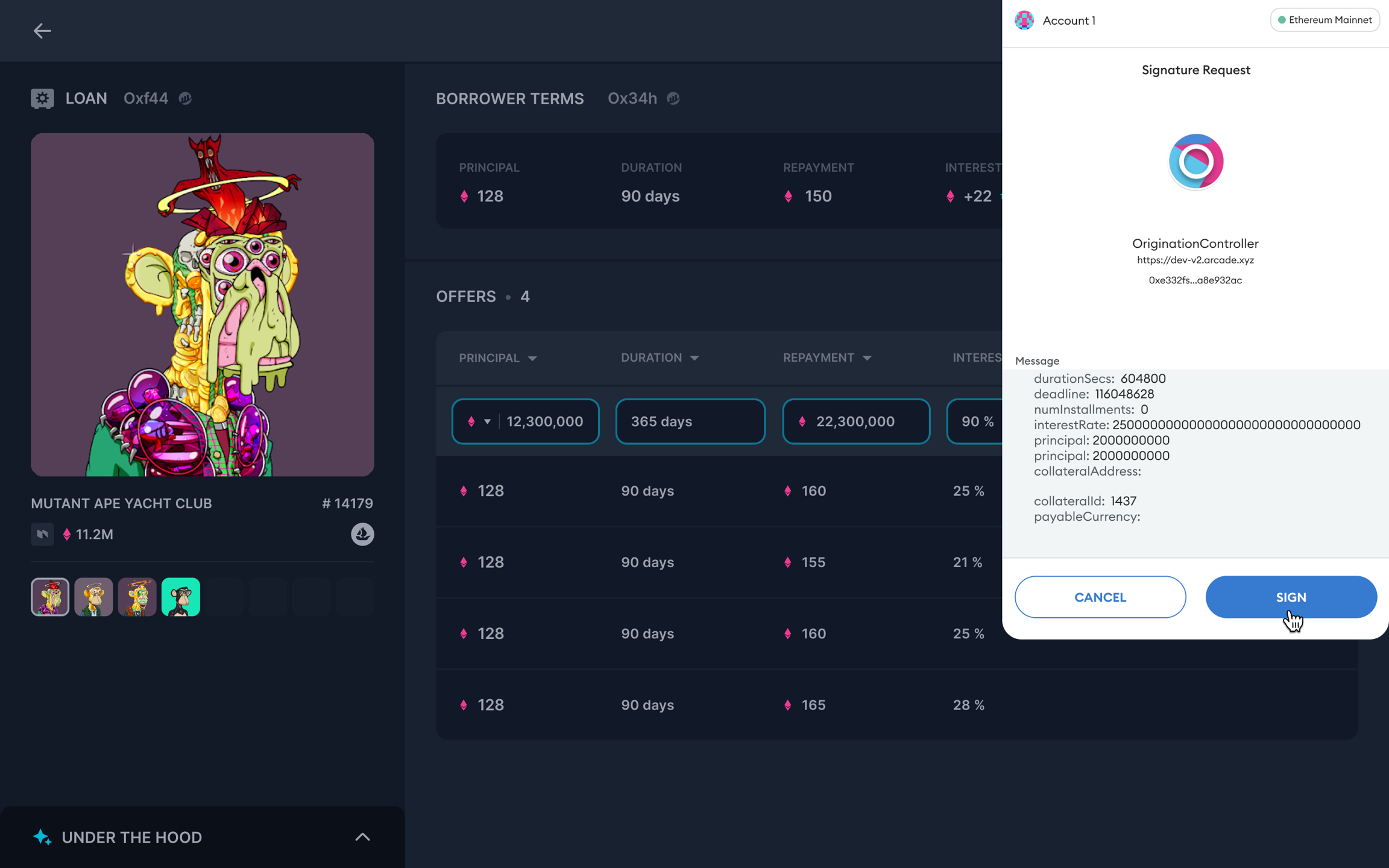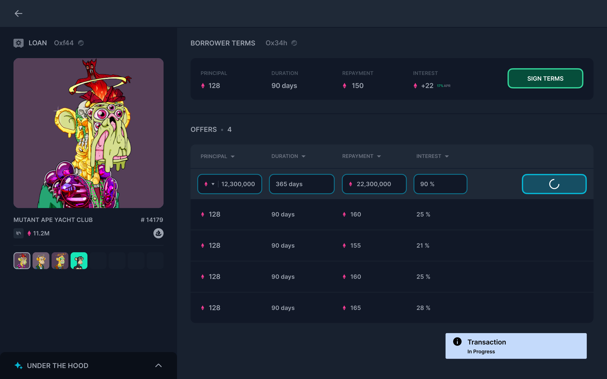 4. 输入条款并确认贷款条款后,用户应单击“Sign Terms”。将立即提示贷方从连接的钱包中签名。应用程序中将出现一条通知,表明正在进行链上交易。