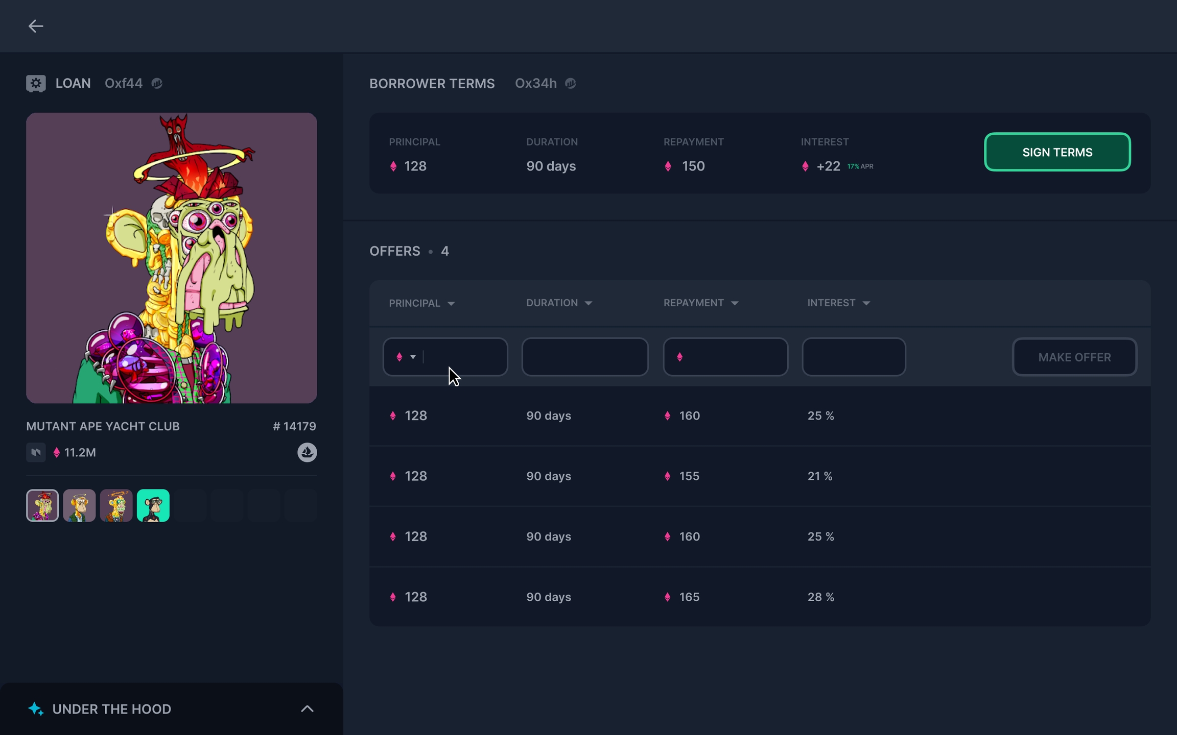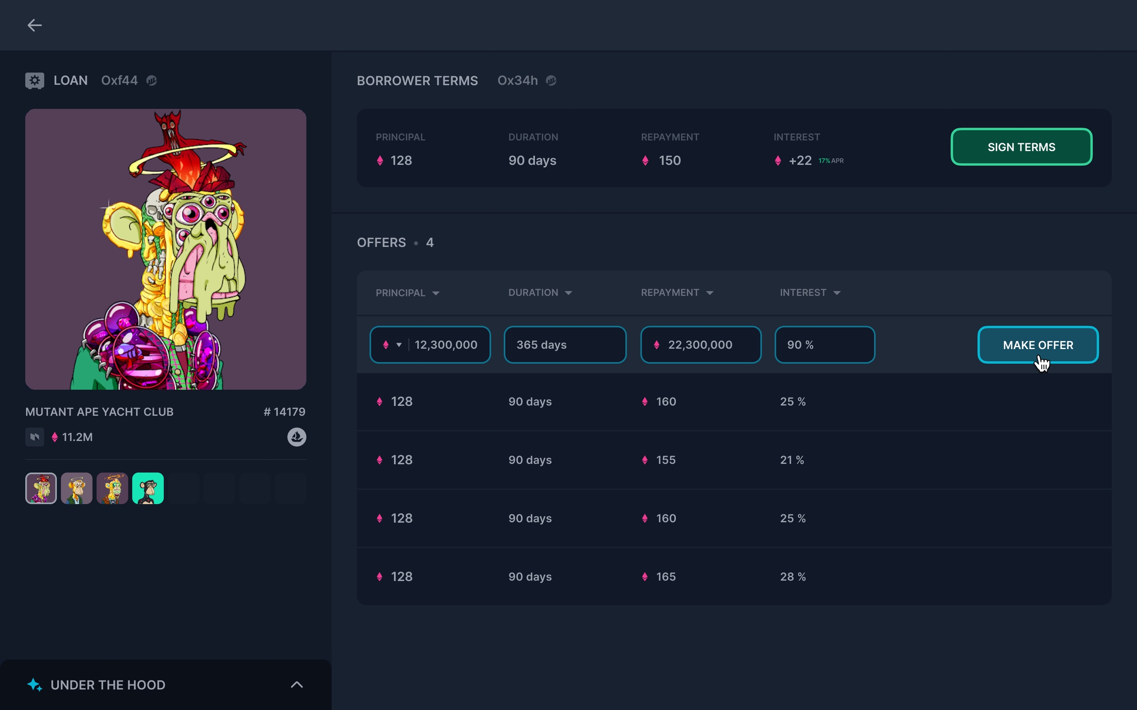 3. 贷方确定资产后,应在“Make Offer”界面中输入相应条款,包括本金金额、还款金额和期限。利率(APR)也将填充。
