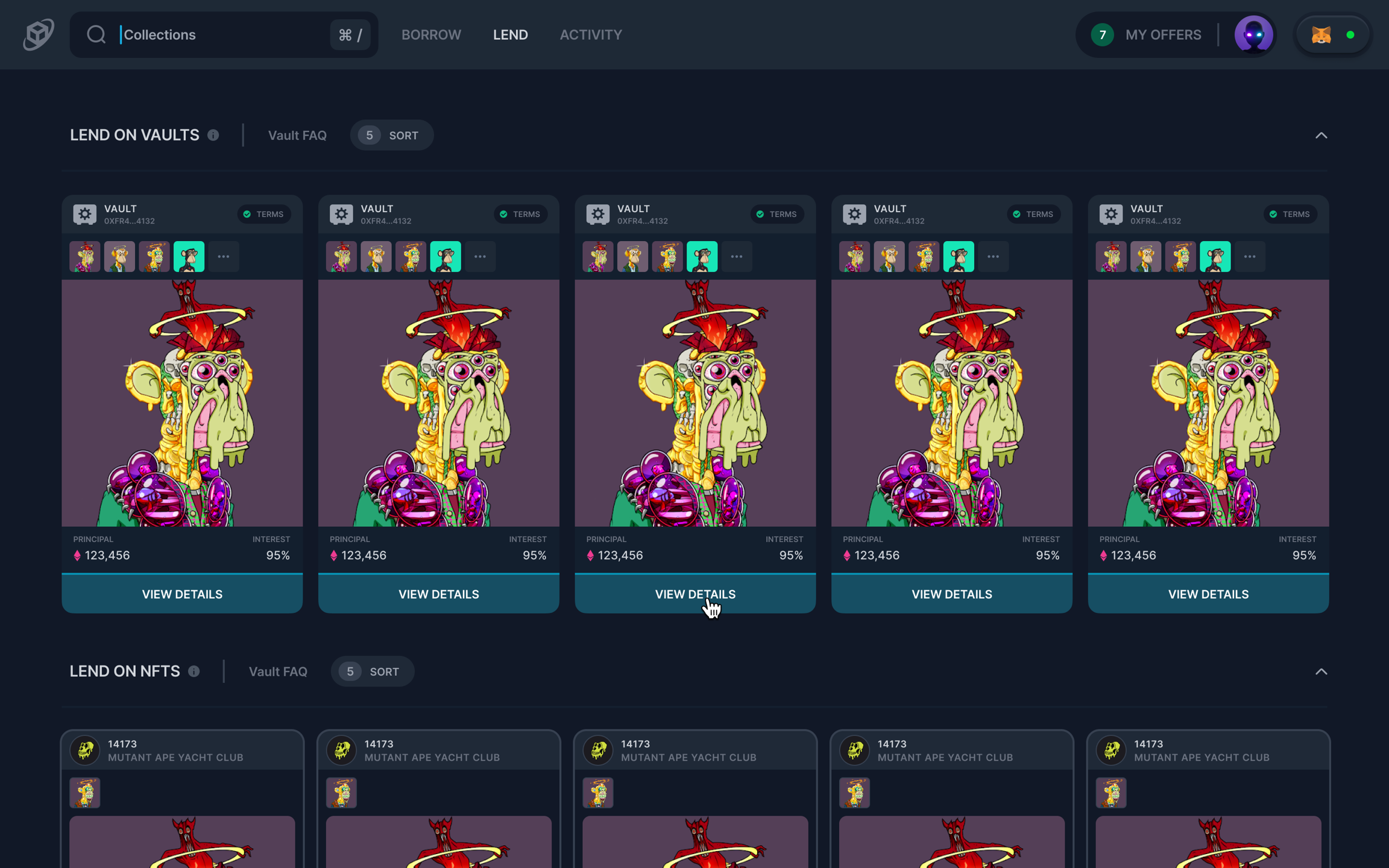 连接钱包后,贷方可以导航到“Lend”选项卡以查看所有对报价开放的Vault或 NFT。