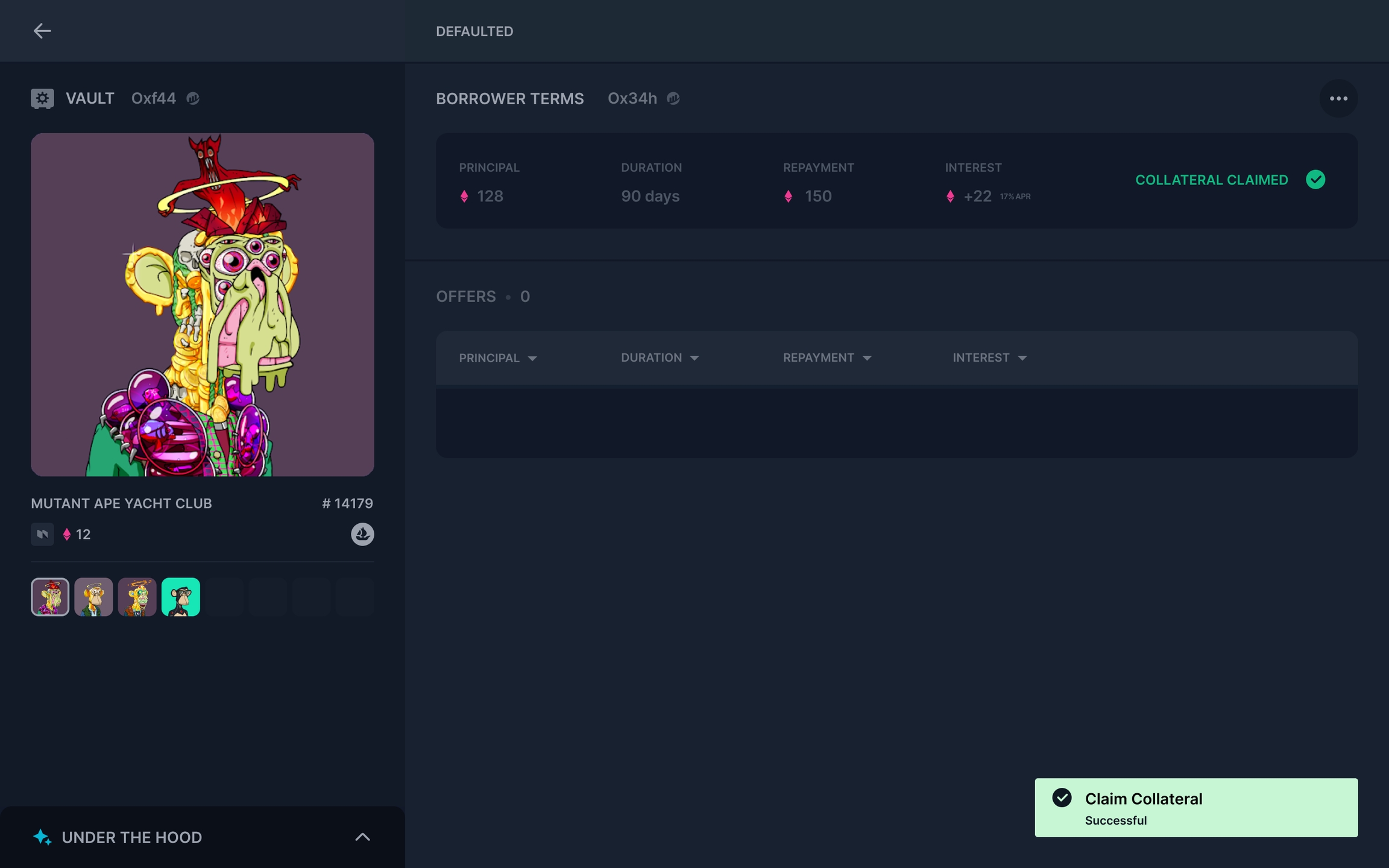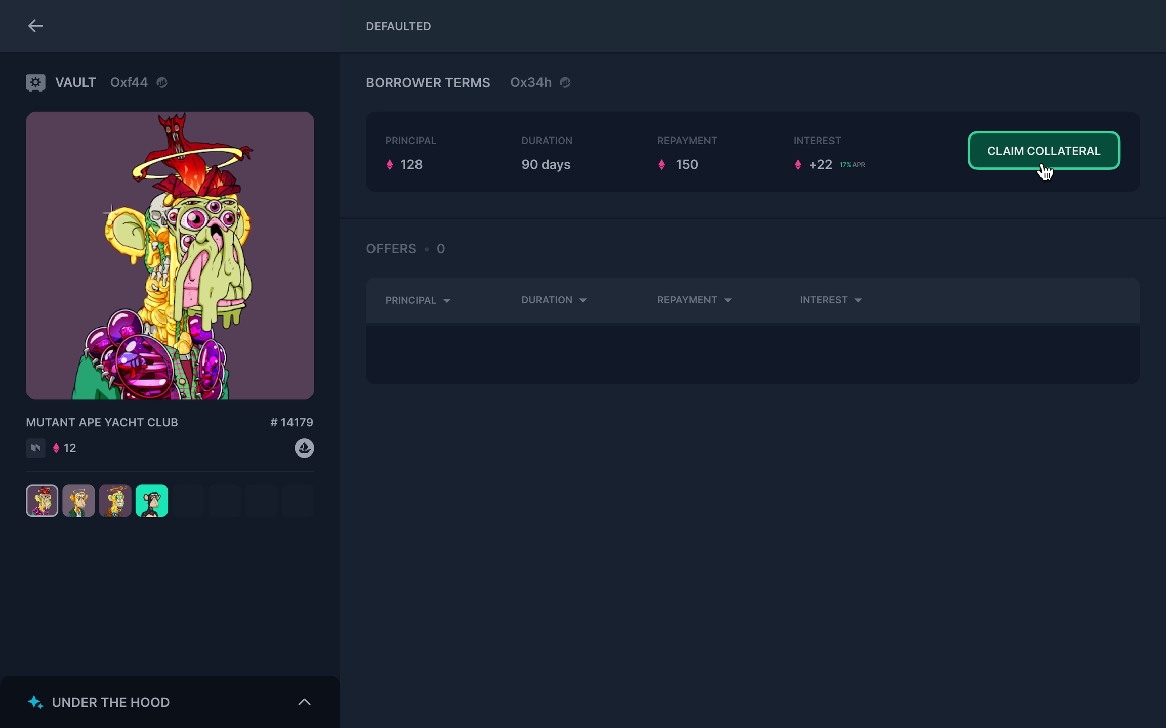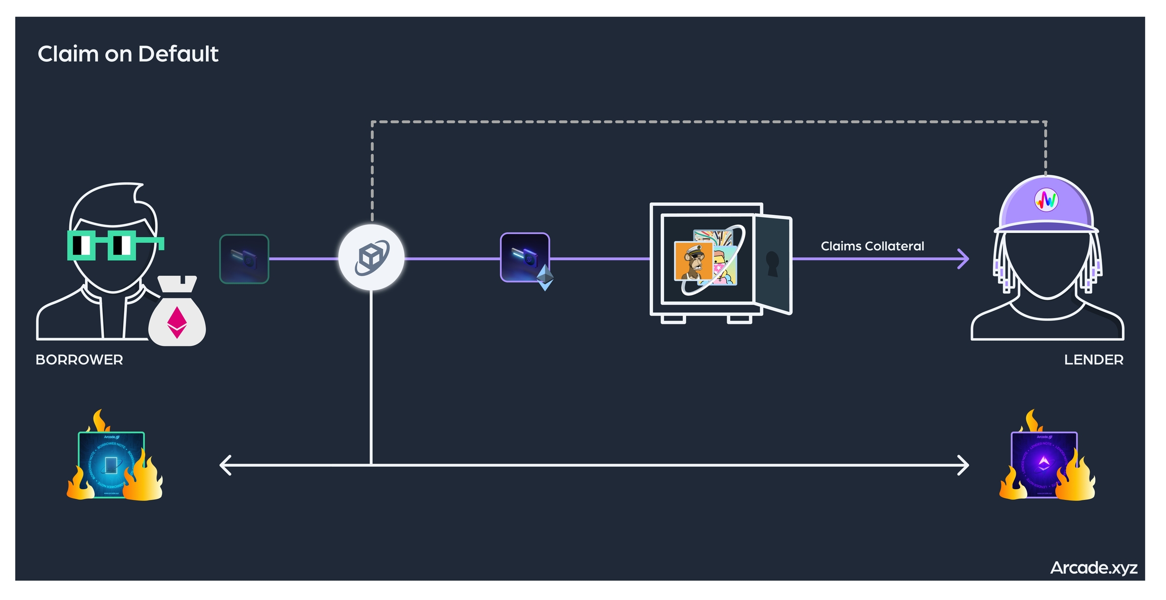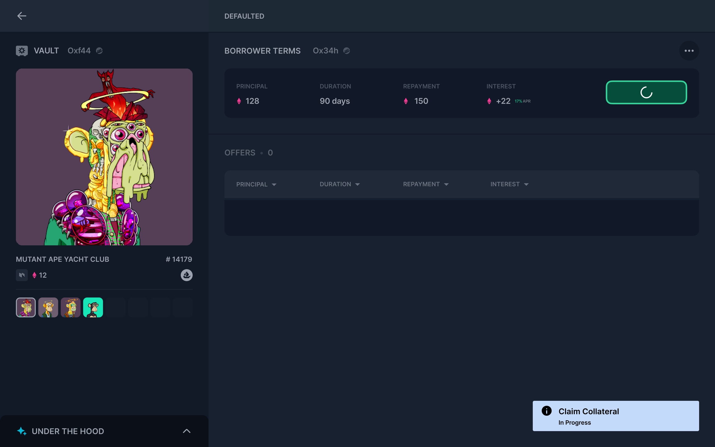 如果借款人未能在贷款到期时偿还约定的还款金额,则贷方可以选择自行索赔基础抵押品(Vault 或 NFT)。