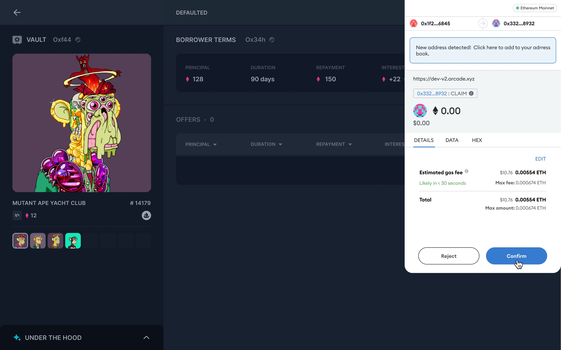 4. 选择 Claim Collateral 后,钱包交易会出现在浏览器上。贷方应在链上交易中确认这一动作,以向连接的钱包索赔底层抵押品(Arcade Vault 或单个 NFT)。确认后,应用程序将显示一条通知,确认交易在链上待处理。