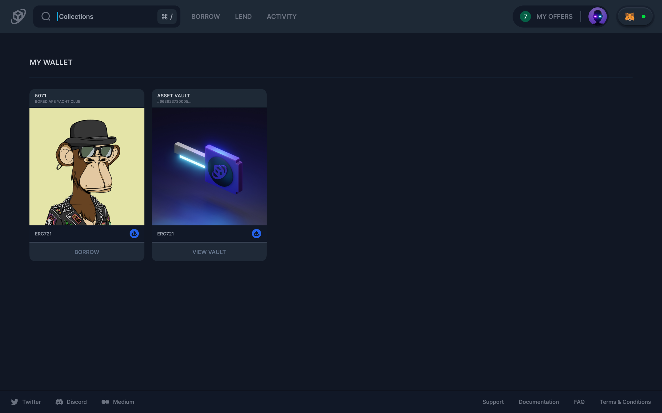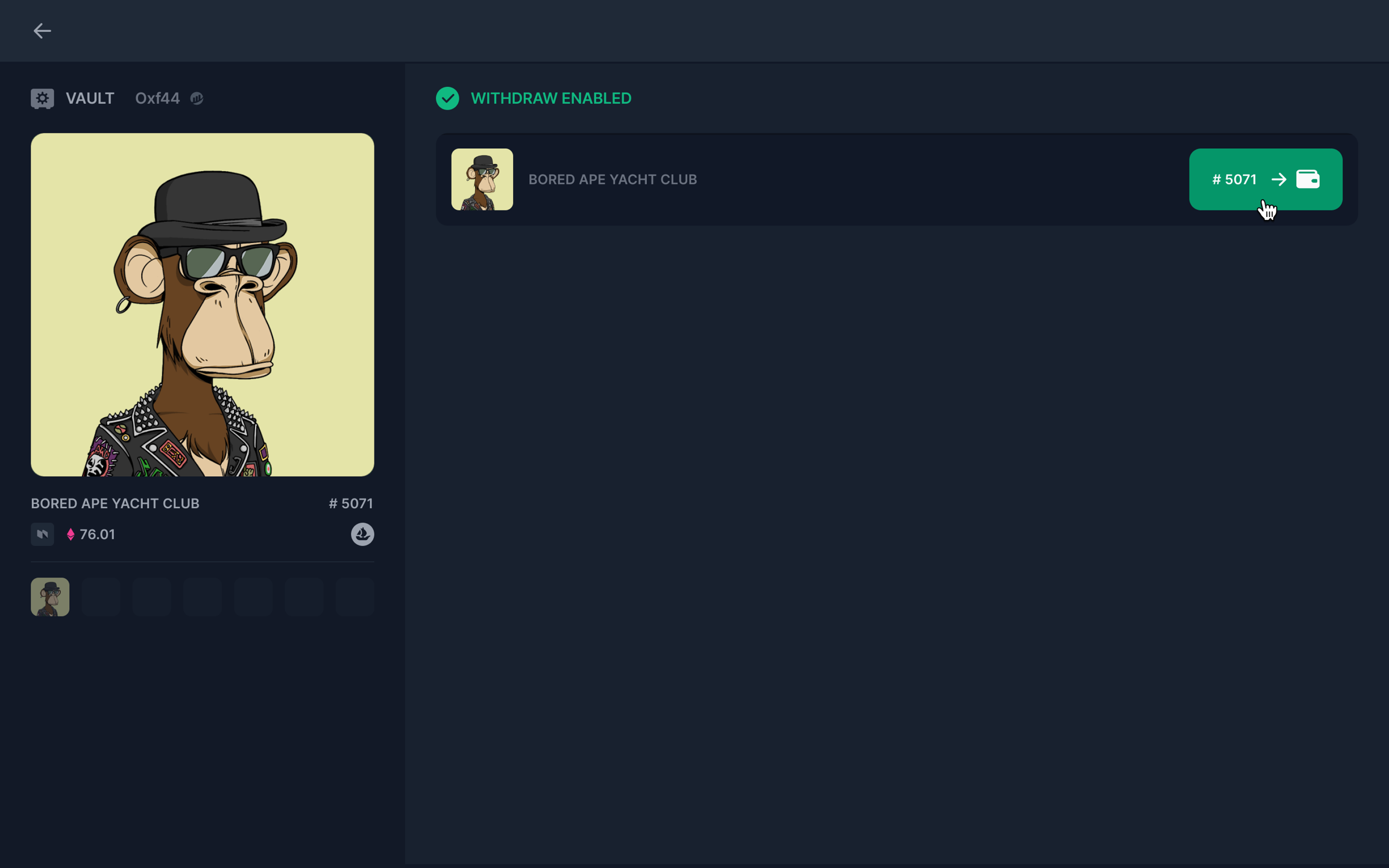在保险库上启用提款后,可以从保险库中单独提取保险库中持有的 NFT。 用户应选择要提取的资产,然后在保险库详细信息页面上选择相应资产旁边的按钮。